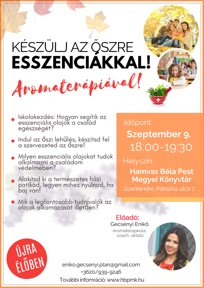 Gyere el, és ismerkedj meg az esszenciális illóolajokkal, tapasztald meg a hatásukat, szerezz egy fantasztikus élményt magadnak, miközben tanulhatsz és kérdezhetsz! A nagy érdeklődésre és sikerre való tekintettel, ismét a Hamvas Béla Pest Megyei Könyvtárban kerül megszervezésre az előadás.