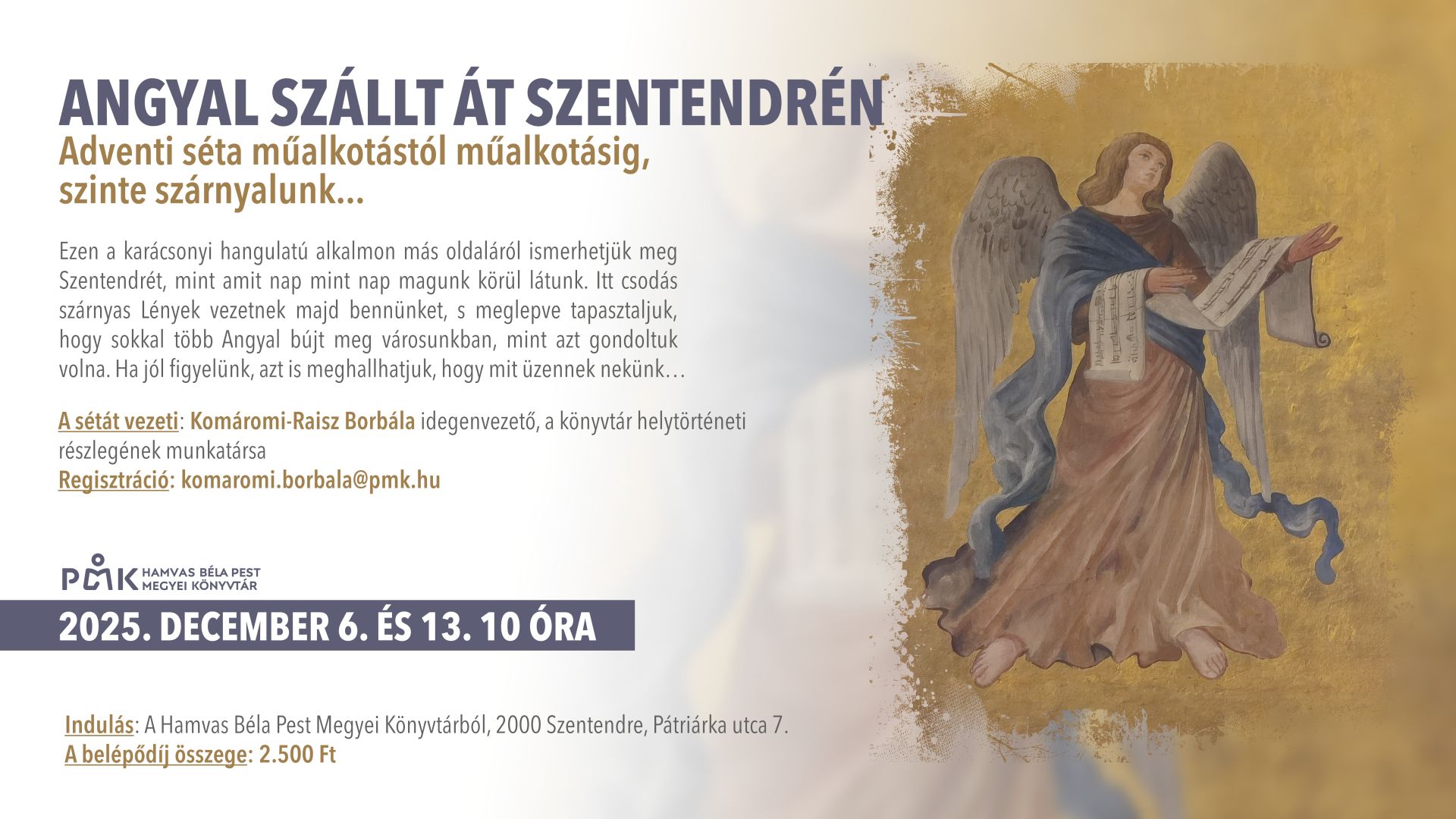 Ezen a karácsonyi hangulatú alkalmon más oldaláról ismerhetjük meg Szentendrét, mint amit nap mint nap magunk körül látunk. Itt csodás szárnyas Lények vezetnek majd bennünket, s meglepve tapasztaljuk, hogy sokkal több Angyal bújt meg városunkban, mint azt gondoltuk volna. Ha jól figyelünk, azt is meghallhatjuk, hogy mit üzennek nekünk…