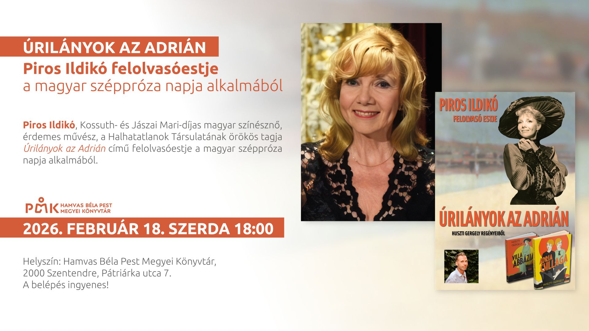 Piros Ildikó, Kossuth- és Jászai Mari-díjas magyar színésznő, érdemes művész, a Halhatatlanok Társulatának örökös tagja Úrilányok az Adrián című felolvasóestje a magyar széppróza napja alkalmából.