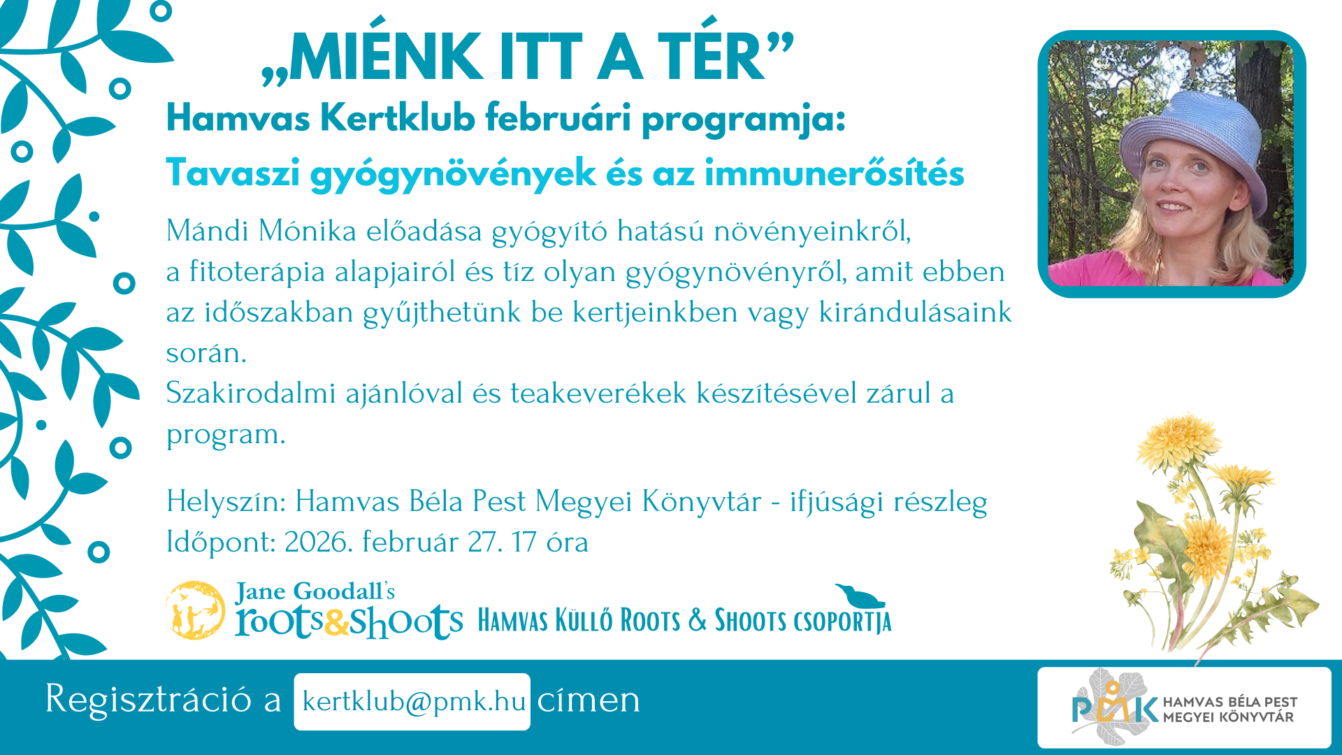 Mándi Mónika előadása gyógyító hatású növényeinkről, a fitoterápia alapjairól és tíz olyan gyógynövényről, amiket ebben az időszakban gyűjthetünk be kertjeinkben vagy kirándulásaink során.