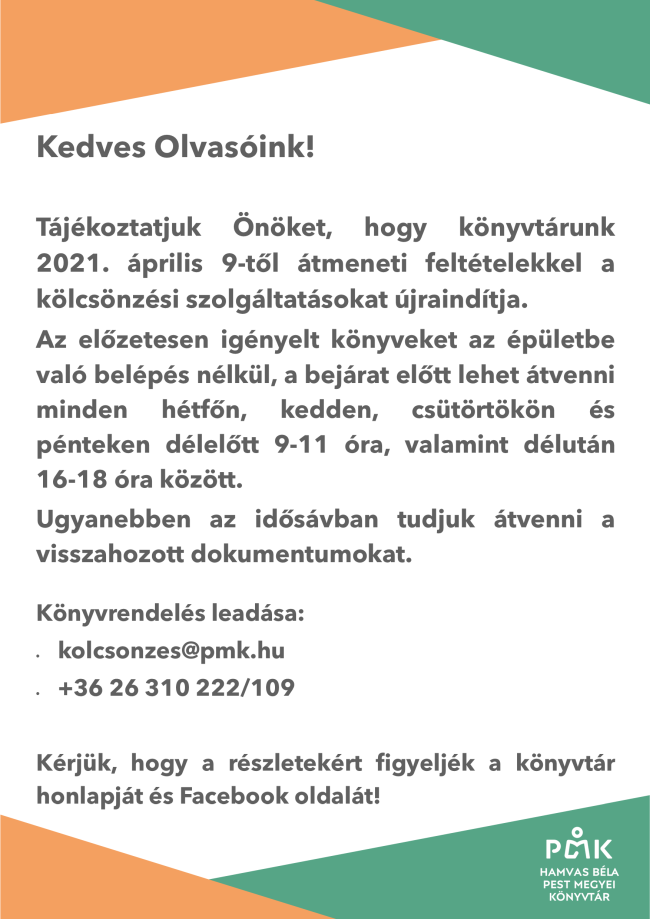 - Továbbra is fogadjuk a kolcsonzes@pmk.hu email címen vagy a +36-26-310-222/109 telefonszámon leadott könyv, CD és DVD rendeléseket.