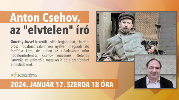 Goretity József bekerült a világ legjobb hat, a kortárs orosz irodalmat valamilyen nyelven megszólaltató fordítója közé, de ebben az előadásában mint irodalomtörténész, Csehov műveinek, életének ismerője és szakértője mutatkozik be a szentendrei érdeklődőknek.