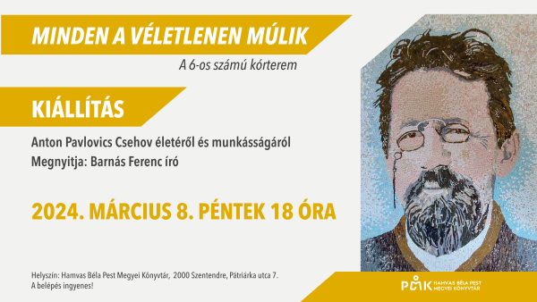 Dátum 2024.03.08. - 18:00 Kiállítás: Anton Pavlovics Csehov életéről és munkásságárólMegnyitja: Barnás Ferenc íróIdőpont: 2024. március 8. péntek 18 óraHelyszín: Hamvas Béla Pest Megyei Könyvtár, 2000 Szentendre, Pátriárka u. 7.A belépés ingyenes!