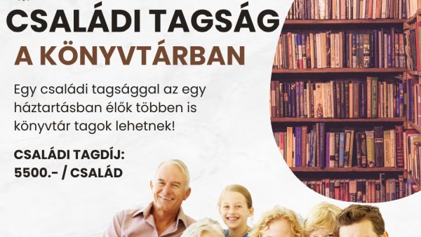 Családi tagsággal az egy háztartásban élők többen is könyvtári tagok lehetnek!Családi tagdíj: 5500 Ft/év