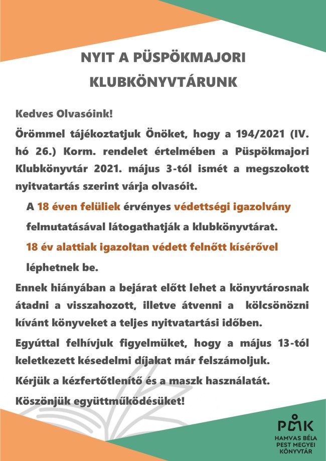 Örömmel tájékoztatjuk Önöket, hogy a 194/2021 (IV. hó 26.) Korm. rendelet értelmében a Püspökmajori Klubkönyvtár 2021. május 3 -tól ismét a megszokott nyitvatartás szerint várja olvasóit.
