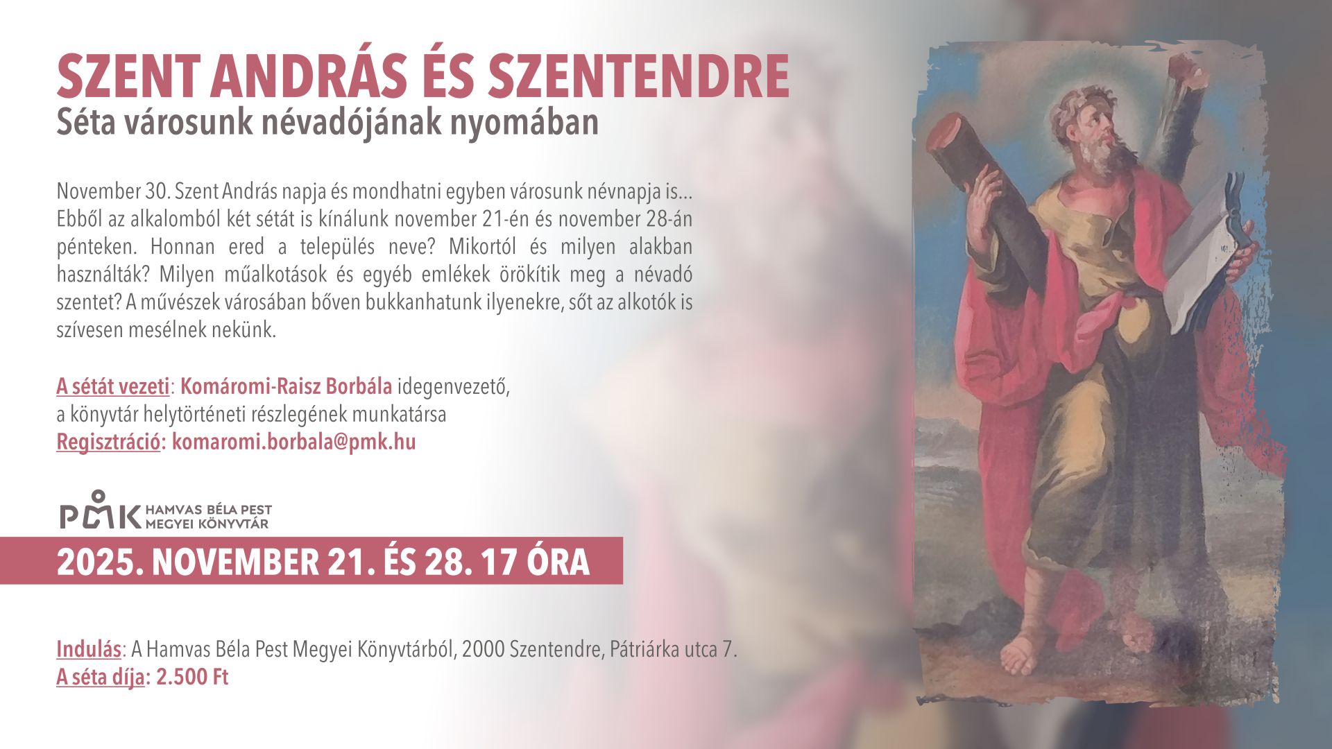 November 30. Szent András napja és mondhatni egyben városunk névnapja is... Ebből az alkalomból két sétát is kínálunk november 21-én és november 28-án pénteken. Honnan ered a település neve? Mikortól és milyen alakban használták? Milyen műalkotások és egyéb emlékek örökítik meg a névadó szentet? A művészek városában bőven bukkanhatunk ilyenekre, sőt az alkotók is szívesen mesélnek nekünk.