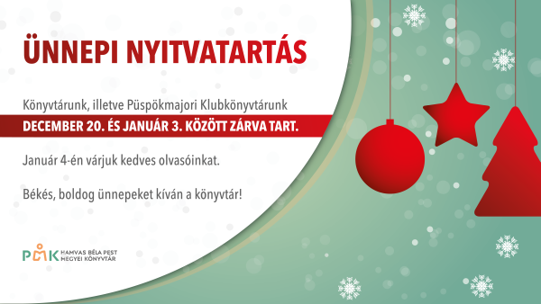 Könyvtárunk, illetve Püspökmajori Klubkönyvtárunk december 20. és január 3. között zárva tart.Január 4-én várjuk kedves olvasóinkat.Békés, boldog ünnepeket kíván a könyvtár!