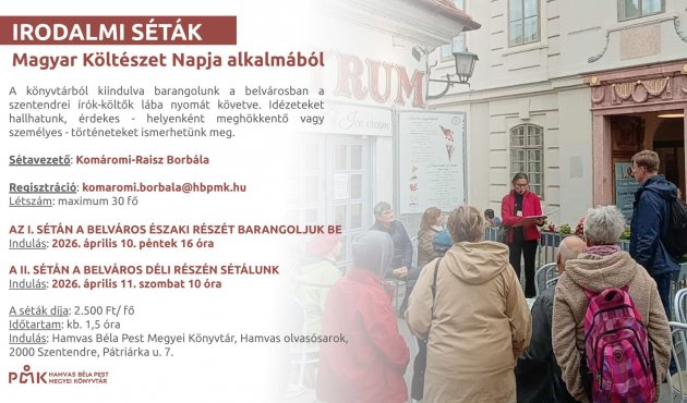 A könyvtárból kiindulva barangolunk a belvárosban a szentendrei írók-költők lába nyomát követve. Idézeteket hallhatunk, érdekes - helyenként meghökkentő vagy személyes - történeteket ismerhetünk meg.