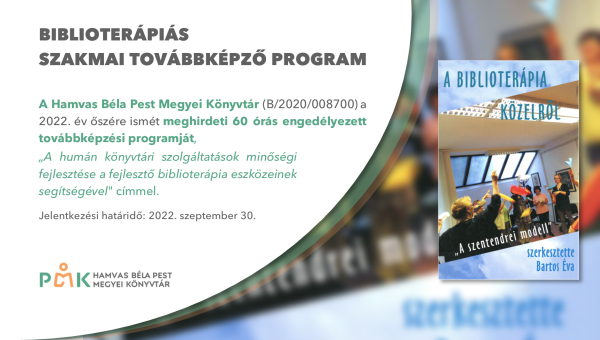A Hamvas Béla Pest Megyei Könyvtár a 2022. év őszére ismét meghirdeti 60 órás engedélyezett továbbképzési programját, „A humán könyvtári szolgáltatások minőségi fejlesztése a fejlesztő biblioterápia eszközeinek segítségével” (B/2020/008700) címmel.