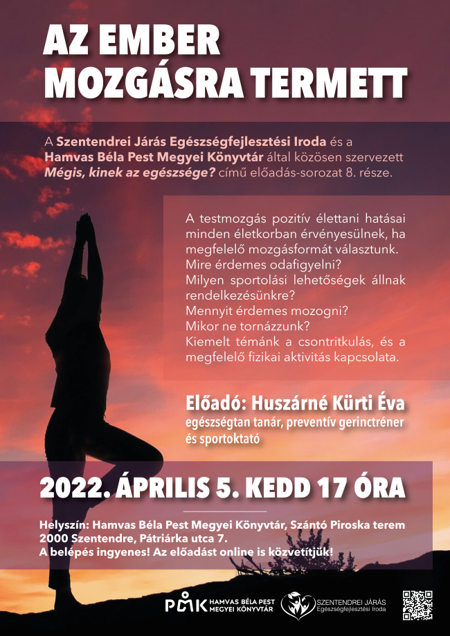 A Szentendrei Járás Egészségfejlesztési Iroda és a Hamvas Béla Pest Megyei Könyvtár által közösen szervezett Mégis, kinek az egészsége? című előadás-sorozat 8. része.