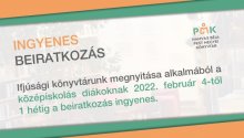 Ifjúsági könyvtárunk megnyitása alkalmából a középiskolás diákoknak 2022. február 4-től 1 hétig a beiratkozás ingyenes.