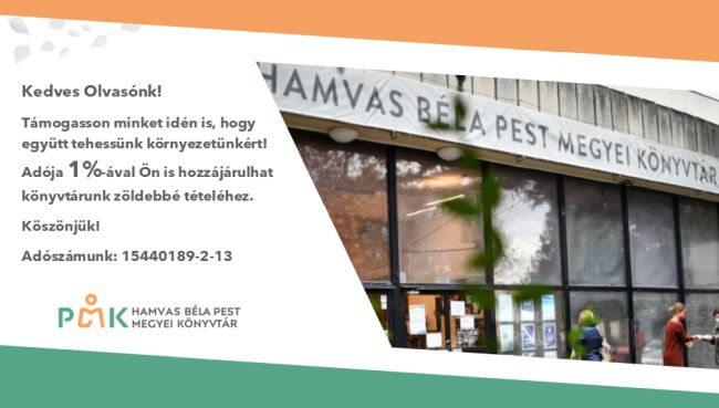 Kedves Olvasónk! Támogasson minket idén is, hogy együtt tehessünk a környezetünkért! Adója 1% -ával Ön is hozzájárulhat könyvtárunk zöldebbé tételéhez. Köszönjük! Adószámunk: 15440189-2-13