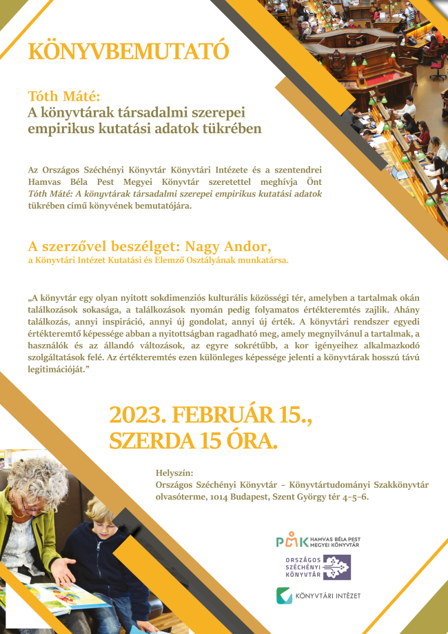 Az Országos Széchényi Könyvtár Könyvtári Intézete és a szentendrei Hamvas Béla Pest Megyei Könyvtár szeretettel meghívja Önt Tóth Máté: A könyvtárak társadalmi szerepei empirikus kutatási adatok tükrében című könyvének bemutatójára.