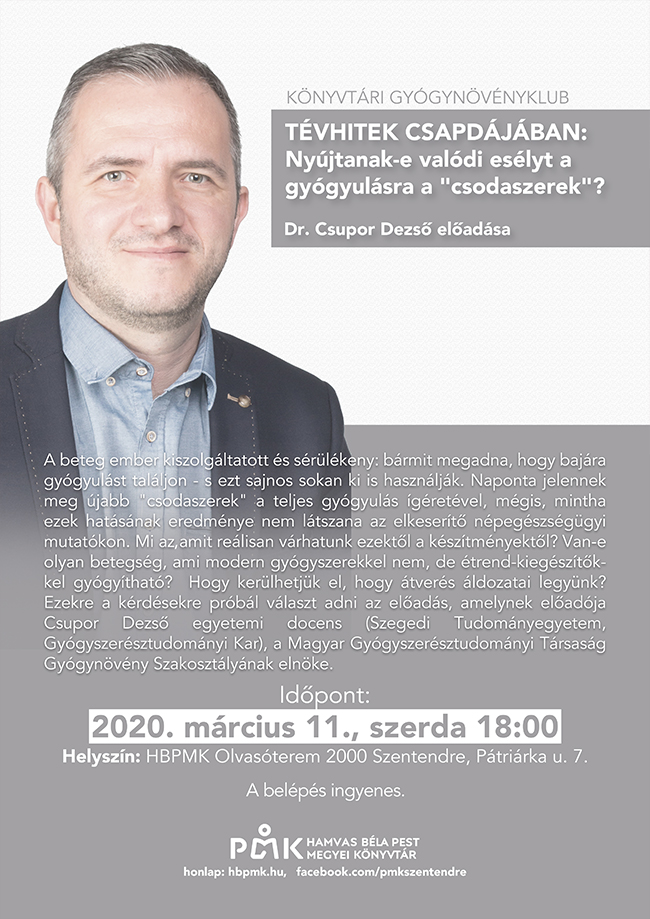 A beteg ember kiszolgáltatott és sérülékeny: bármit megadna, hogy bajára gyógyulást találjon - s ezt sajnos sokan ki is használják. Naponta jelennek meg újabb "csodaszerek" a teljes gyógyulás ígéretével, mégis, mintha ezek hatásának eredménye nem látszana az elkeserítő népegészségügyi mutatókon. Mi az amit reálisan várhatunk ezektől a készítményektől? Van-e olyan betegség, ami modern gyógyszerekkel nem, de étrend-kiegészítőkkel gyógyítható?  Hogy kerülhetjük el, hogy átverés áldozatai legyünk? Ezekre a kérdésekre próbál választ adni az előadás, amelynek előadója Csupor Dezső egyetemi docens (Szegedi Tudományegyetem, Gyógyszerésztudományi Kar), a Magyar Gyógyszerésztudományi Társaság Gyógynövény Szakosztályának elnöke.