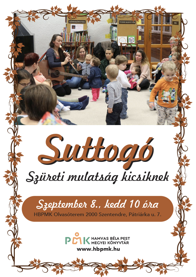 Dátum 2020.09.08. - 10:00 Zenés-mesés szüreti mulatság Balázs Mariettával. Helyszín: Hamvas Béla Pest Megyei Könyvtár - olvasóterem (Szentendre, Pátriárka utca 7.). A belépés ingyenes!