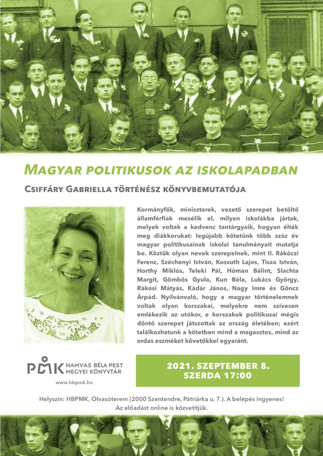 Kormányfők, miniszterek, vezető szerepet betöltő államférfiak mesélik el, milyen iskolákba jártak, melyek voltak a kedvenc tantárgyaik, hogyan élték meg diákkorukat: legújabb kötetünk több száz év magyar politikusainak iskolai tanulmányait mutatja be. Köztük olyan nevek szerepelnek, mint II. Rákóczi Ferenc, Széchenyi István, Kossuth Lajos, Tisza István, Horthy Miklós, Teleki Pál, Hóman Bálint, Slachta Margit, Gömbös Gyula, Kun Béla, Lukács György, Rákosi Mátyás, Kádár János, Nagy Imre és Göncz Árpád. Nyilvánvaló, hogy a magyar történelemnek voltak olyan korszakai, melyekre nem szívesen emlékezik az utókor, e korszakok politikusai mégis döntő szerepet játszottak az ország életében; ezért találkozhatunk a kötetben mind a magasztos, mind az ordas eszméket követőkkel egyaránt.
