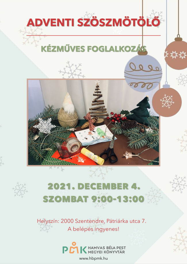 December 4-én, szombaton 9 órától 13 óráig családi kézműves foglalkozásra hívjuk kedves olvasóinkat a Hamvas Béla Pest Megyei Könyvtárba, ahol karácsonyi apróságokat készíthetnek gyerekek és felnőttek egyaránt.