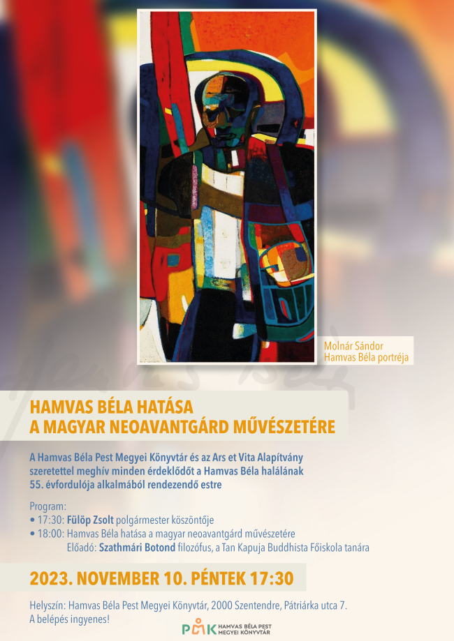A Hamvas Béla Pest Megyei Könyvtár és az Ars et Vita Alapítvány szeretettel meghív minden érdeklődőt a Hamvas Béla halálának 55. évfordulója alkalmából rendezendő estre.