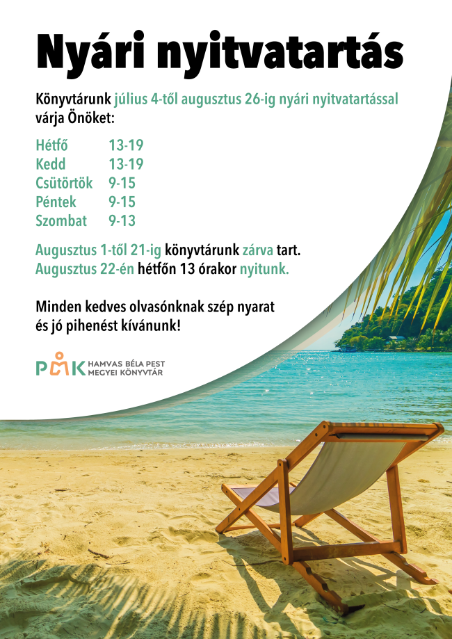 Könyvtárunk július 4-től augusztus 26-ig nyári nyitvatartással várja Önöket: