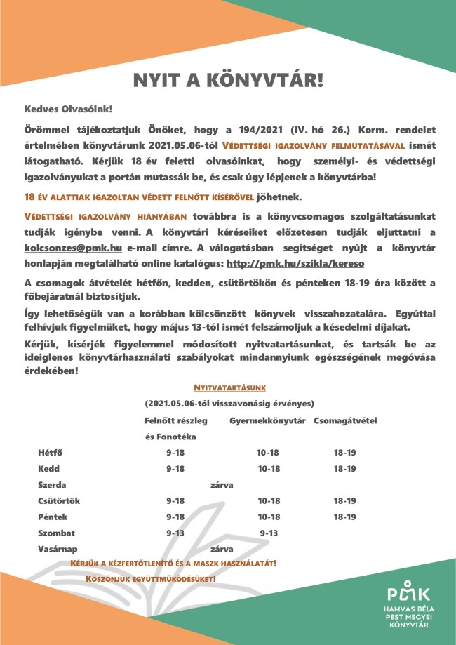 Örömmel tájékoztatjuk Önöket, hogy a 194/2021 (IV. hó 26.) Korm. rendelet értelmében könyvtárunk 2021.05.06 -tól VÉDETTSÉGI IGAZOLVÁNY FELMUTATÁSÁVAL ismét látogatható. Kérjük 18 év feletti olvasóinkat, hogy személyi- és védettségi igazolványukat a portán mutassák be, és csak úgy lépjenek a könyvtárba!