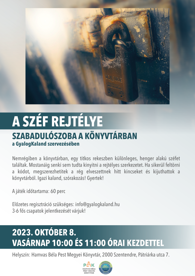 Nemrégiben a könyvtárban, egy titkos rekeszben különleges, henger alakú széfet találtak. Mostanáig senki sem tudta kinyitni a rejtélyes szerkezetet. Ha sikerül feltörni a kódot, megszerezhetitek a rég elveszettnek hitt kincseket és kijuthattok a könyvtárból. Igazi kaland, szórakozás! Gyertek!