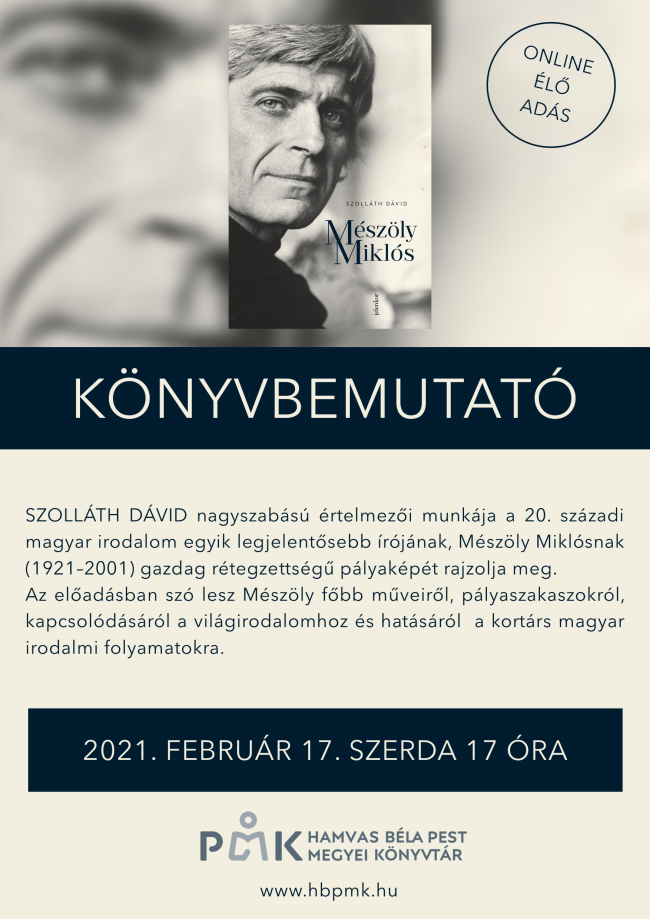 Az előadásban szó lesz Mészöly főbb műveiről, pályaszakaszokról, kapcsolódásáról a világirodalomhoz és hatásáról a kortárs magyar irodalmi folyamatokra.