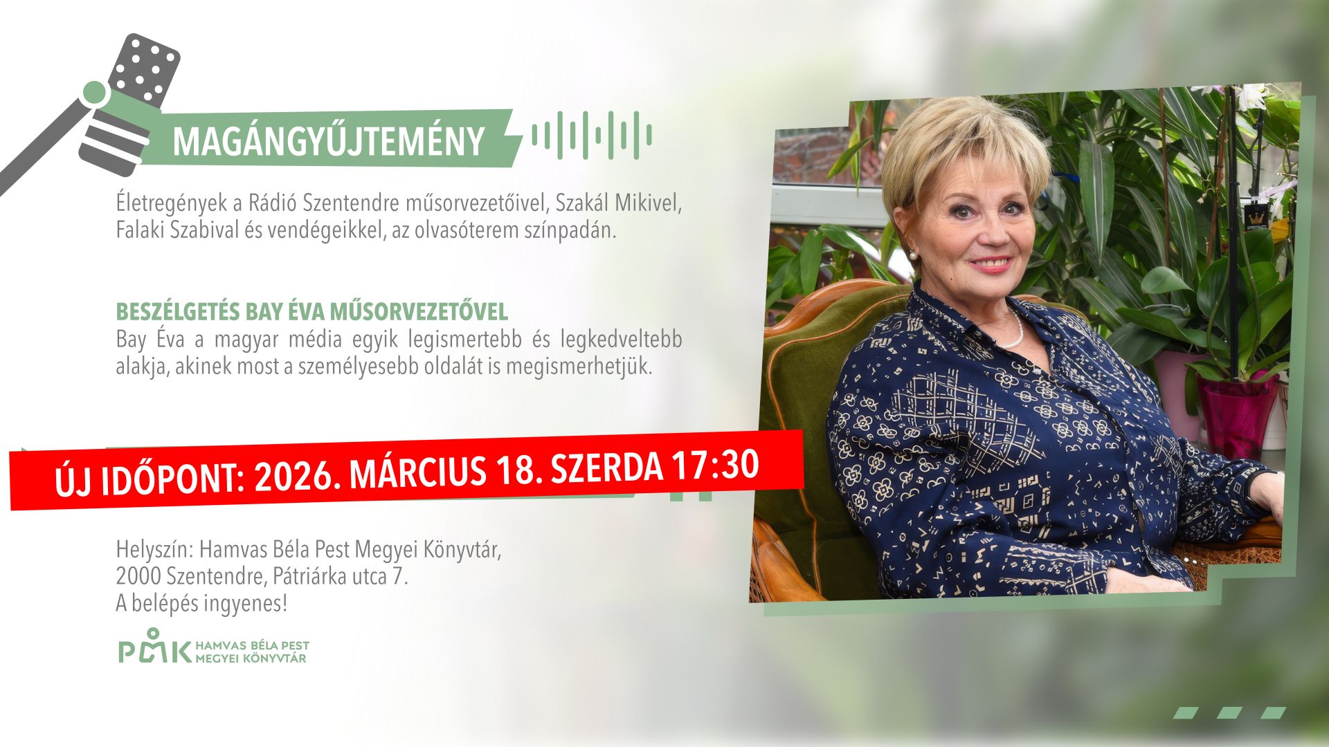 Helyszín: Hamvas Béla Pest Megyei Könyvtár, 2000 Szentendre, Pátriárka utca 7.