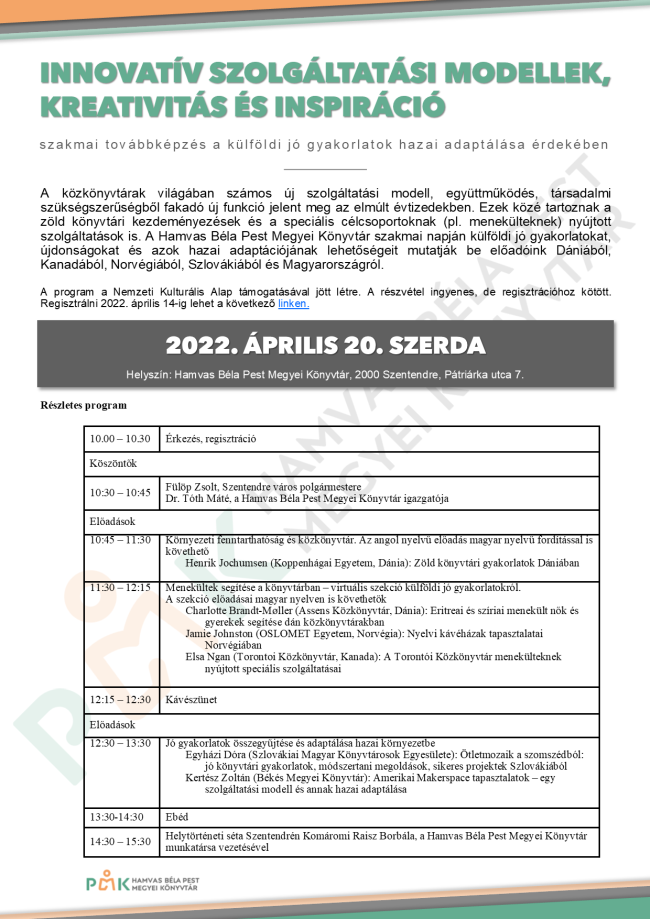 A közkönyvtárak világában számos új szolgáltatási modell, együttműködés, társadalmi szükségszerűségből fakadó új funkció jelent meg az elmúlt évtizedekben. Ezek közé tartoznak a zöld könyvtári kezdeményezések és a speciális célcsoportoknak (pl. menekülteknek) nyújtott szolgáltatások is. A Hamvas Béla Pest Megyei Könyvtár szakmai napján külföldi jó gyakorlatokat, újdonságokat és azok hazai adaptációjának lehetőségeit mutatják be előadóink Dániából, Kanadából, Norvégiából, Szlovákiából és Magyarországról.