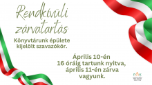 Könyvtárunk épülete kijelölt szavazókör.Április 10-én 16 óráig tartunk nyitva, április 11-én zárva vagyunk.