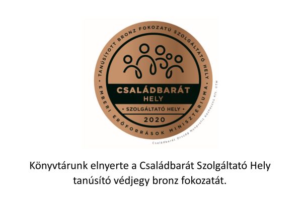 Örömmel adjuk hírül, hogy könyvtárunk elnyerte a Családbarát Szolgáltató Hely tanúsító védjegy bronz fokozatát.