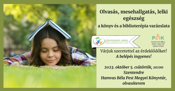 Zaklatott és gyakran személytelen világunkban különös jelentősége lehet a lélek gyógyításának, az olvasás, a mese, általában a könyv gyógyító erejének. A biblioterápia, amely egyre népszerűbb a világon, éppen ezt a célt szolgálja. Segít a szorongás csökkentésében, serkenti a képzeletet, fokozza az empátiát, megkönnyíti a kapcsolatteremtést. Ezekről és még sok minden másról hallhatnak a most következő előadásban.