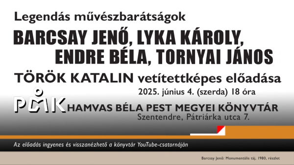 Dátum 2025.06.04. - 18:00 Barcsay Jenő, Lyka Károly, Endre Béla, Tornyai János.Török Katalin vetítettképes előadása.Időpont: 2025. június 4. szerda 18 óraHelyszín: Hamvas Béla Pest Megyei Könyvtár, 2000 Szentendre, Pátriárka utca 7.A belépés ingyenes!