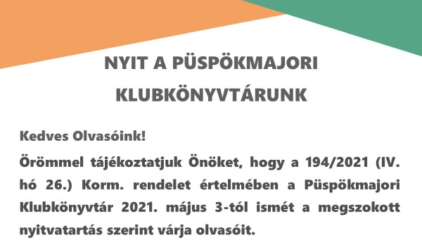 Örömmel tájékoztatjuk Önöket, hogy a 194/2021 (IV. hó 26.) Korm. rendelet értelmében a Püspökmajori Klubkönyvtár 2021. május 3 -tól ismét a megszokott nyitvatartás szerint várja olvasóit.